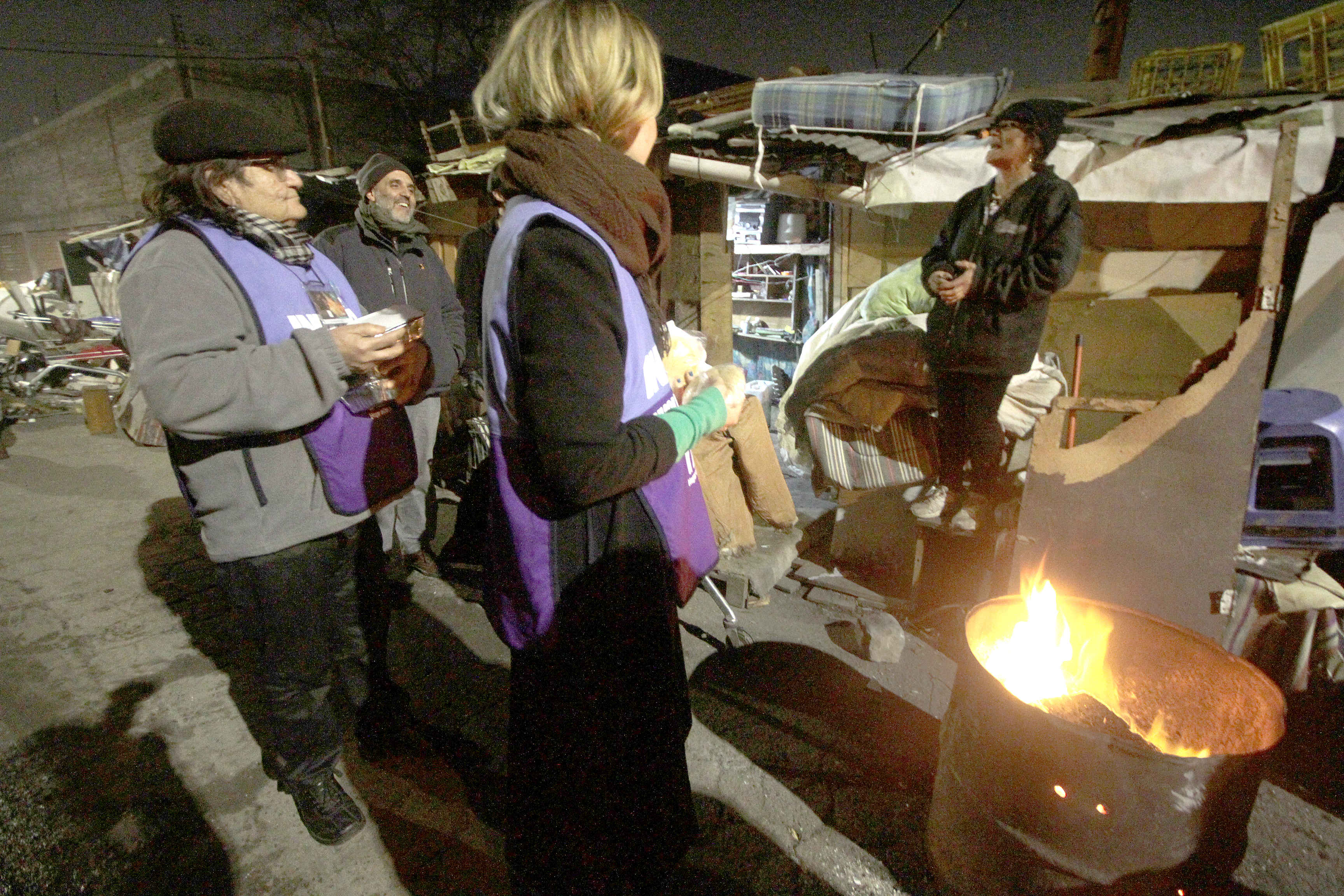 Todas esas preguntas, en especial la última, se amontonan en el furgón manejado por Raúl, quien sale todas las noches con distintos grupos de voluntarios. Una niebla rastrera, unta de humedad los vidrios del vehículo y apenas vemos para afuera. Salimos del Hogar de Cristo, de ahí del Santuario del Padre Hurtado, al costado de General Velásquez, y avanzamos por un Santiago gris, de luces mortecinas, hasta parar en una calle paralela a Santa Rosa y perpendicular a Carlos Valdovinos.