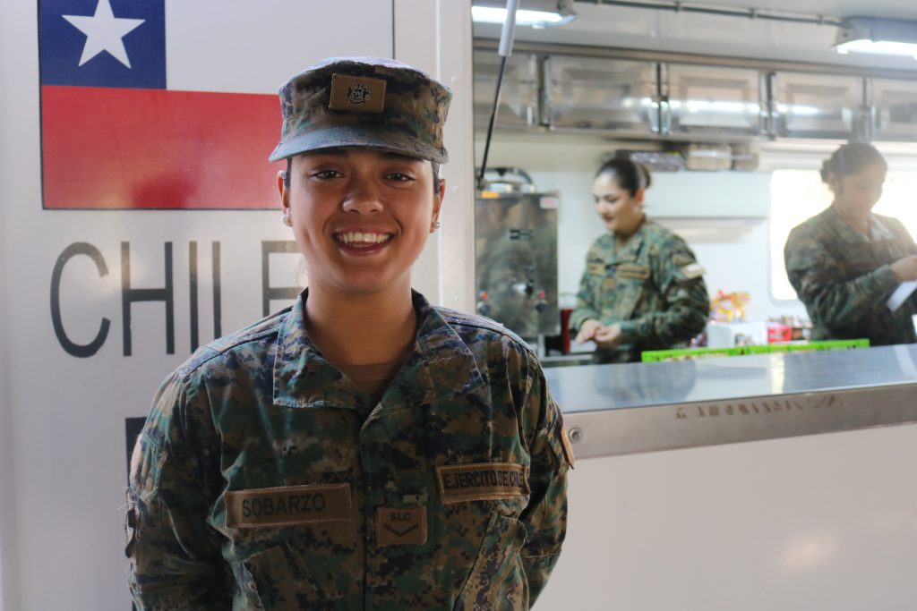 “Desde el día 1 que nos tocó ir a parar al Hogar de Cristo, porque no teníamos dónde llegar, nos recibieron con los brazos abiertos. Lo pasamos bien y vimos hartas historias”, cuenta Thyare Sobarzo Herrera, 21 años, cabo conscripto del Regimiento Logístico N° 2 Arsenales De Guerra del Ejército de Chile.